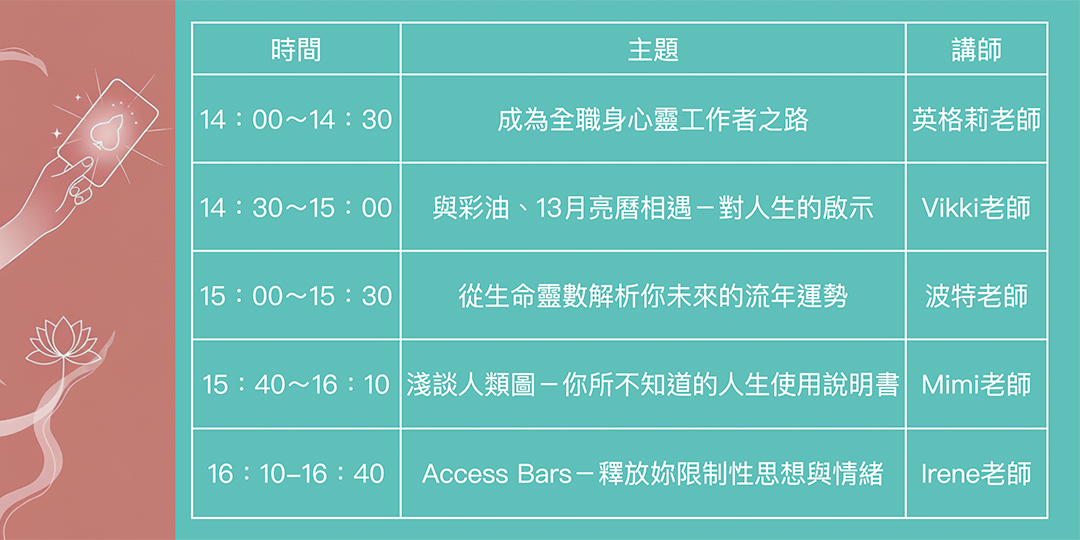 瞭解不同的身心靈角色與工具,對人生的幫助與指引,洞察人生的多元可能與答案,遇見更好的自己。各講堂時間與主題如下:
