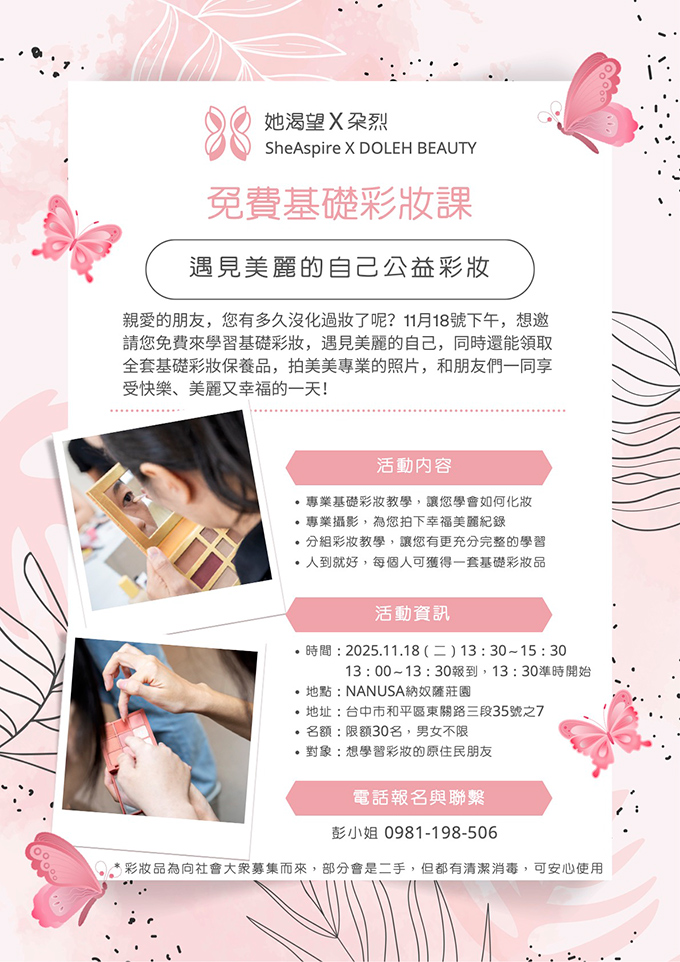 【志工招募】2025第63次遇見美麗的自己公益彩妝-彩妝師・攝影師・活動幫手目前公益彩妝即將邁入第11年,從初期一年一場,到甚至一年全台累計13場,至今已累計超過50場次,足跡遠至離島偏鄉,創造了許多美麗的故事與正面影響,盼能夠邀請您的支持與參與,讓更多美好能夠發生!